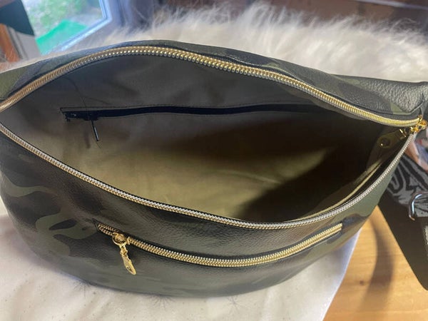 Sac banane militaire en similicuir avec fermeture éclair. Poche à l'avant, et petite poche dans le sac. Tout est fait main.