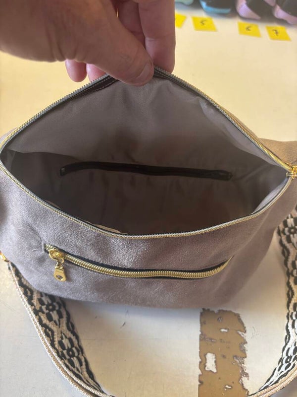 Sac banane en imitation daim gris avec fermeture éclair. Poche à l'avant, et petite poche dans le sac. Tout est fait main.
